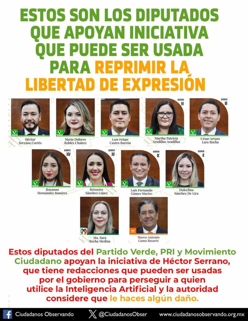 Por su parte, el director general de Cambio de Ruta, Luis González Lozano alertó que, con esta iniciativa se busca criminalizar el uso de la Inteligencia Artificial, lo cual es inconstitucional y violario de los derechos fundamentales, pues se quiere castigar hasta con 12 años de prisión a quien cree memes, parodias o crítica política con IA; criminaliza “cualquiera que sea el propósito” incluso uso periodístico o artístico y, menciona términos vagos como “alarma social” o “menoscabar autoridad”, lo que se generaría la censura.