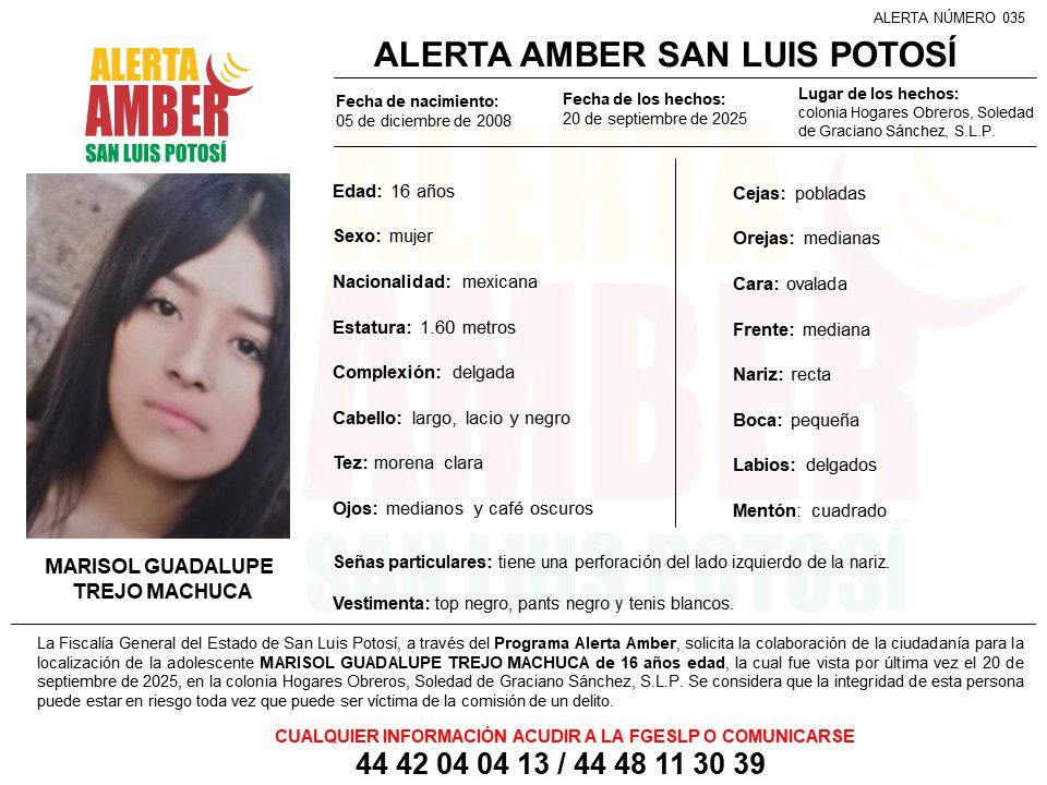 La Fiscalía General del Estado de San Luis Potosí (FGESLP) activó una ficha de Alerta Amber para la localización de Marisol Guadalupe Trejo Machuca, de 16 años de edad, quien fue vista por última vez el 20 de septiembre de 2025 en la colonia Hogares Obreros, en Soledad de Graciano Sánchez.