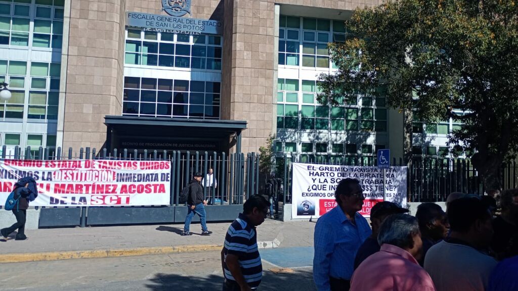 Fue este jueves por la tarde que, los ruleteros colocaron una manta fuera de la Fiscalía que decía: “Gremio estatal de taxistas unidos exigimos la destitución inmediata de Araceli Martínez Acosta de la SCT”.
