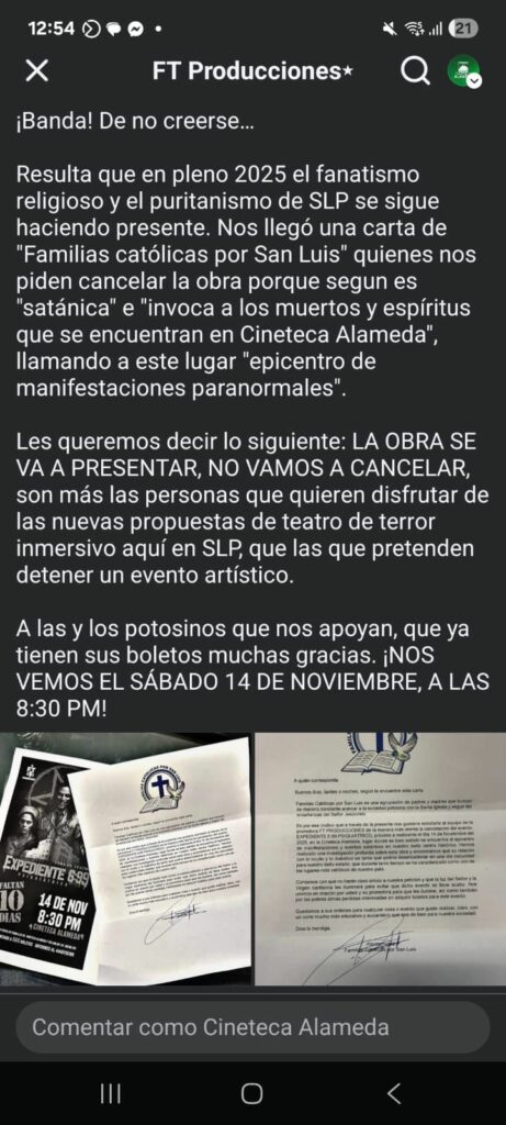 “La obra se va a presentar. No vamos a cancelar. Son más las personas que quieren disfrutar nuevas propuestas de teatro de terror inmersivo en San Luis Potosí que quienes buscan detener un evento artístico”, expresó la compañía en un comunicado.