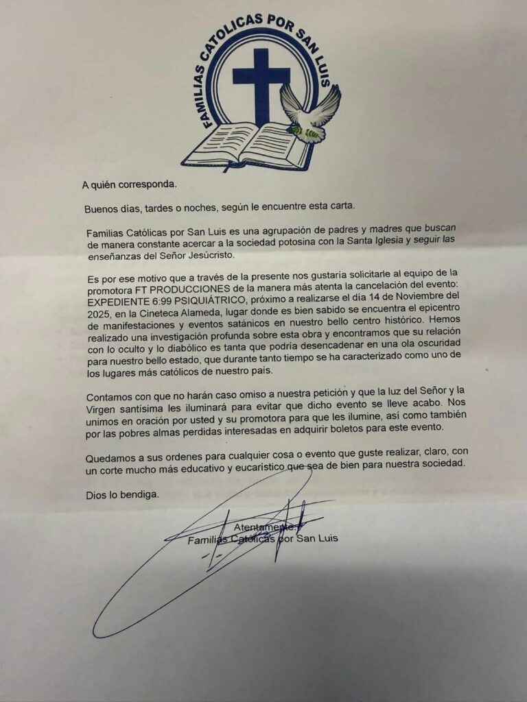 El grupo “Familias Católicas por San Luis” solicitó a FT Producciones cancelar la puesta en escena de terror “Expediente 6:99 Psiquiátrico”, programada para el 14 de noviembre en la Cineteca Alameda.
