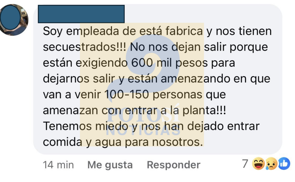 Una trabajadora que logró comunicarse desde el interior de la fábrica aseguró que no los dejan salir ni recibir agua o alimentos, lo que ha generado temor y angustia entre el personal retenido. “Nos tienen secuestrados, no dejan entrar ni salir a nadie”, se lee en uno de los mensajes compartidos en redes sociales. Aunque finalmente no pasó a mayores y todo se resolvió .