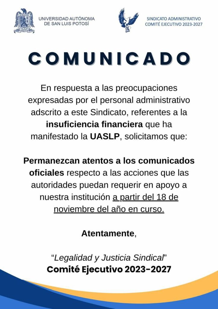 A través de un comunicado difundido en redes sociales, se informó que, en respuesta a las preocupaciones expresadas por el personal administrativo adscrito al sindicato, referente a la insuficiencia financiera que ha manifestado la universidad solicitan estar atentos en caso de tener que irse a paro.