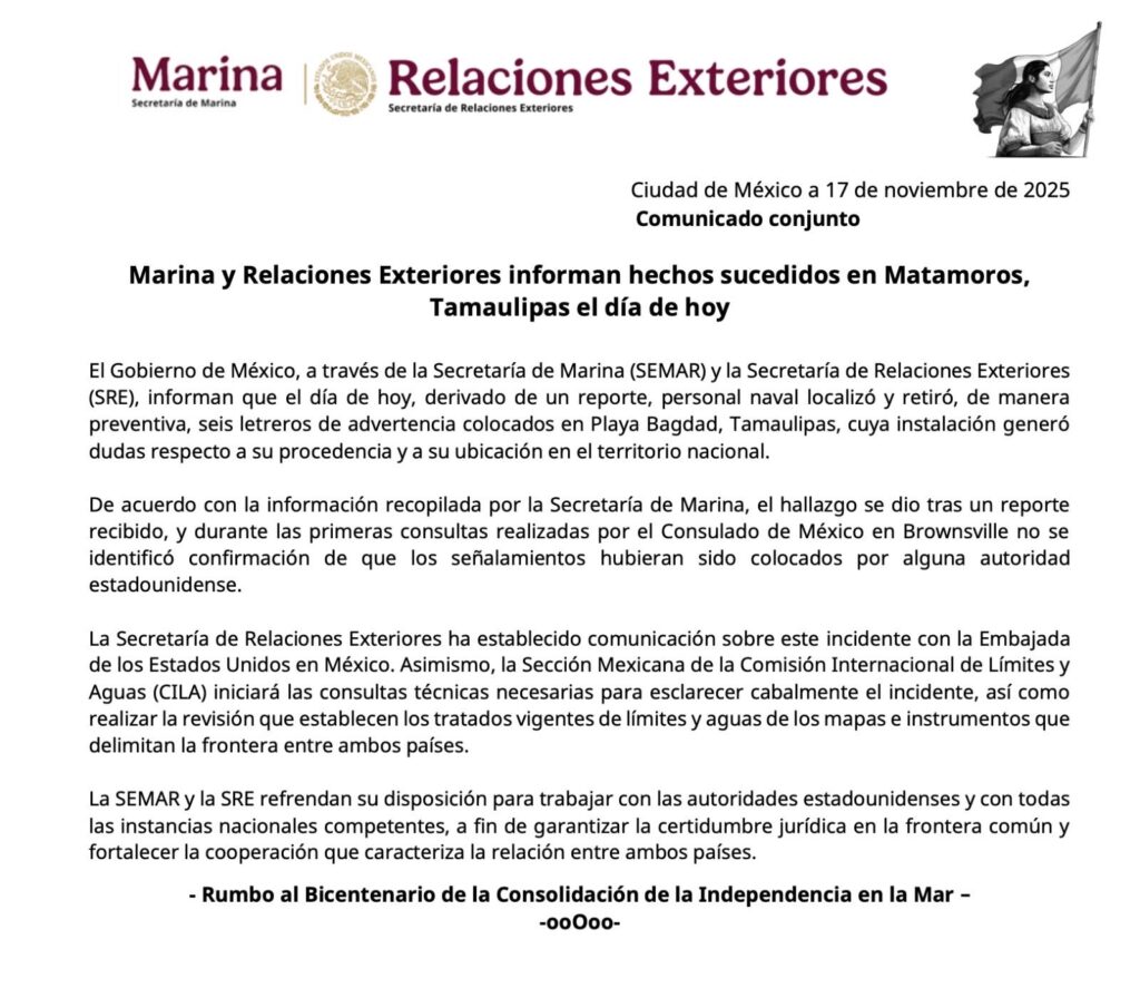 La dependencia explicó que, tras las primeras verificaciones, “no se identificó confirmación de que los señalamientos hubieran sido colocados por alguna autoridad estadounidense”, de acuerdo con consultas realizadas por el Consulado de México en Brownsville.