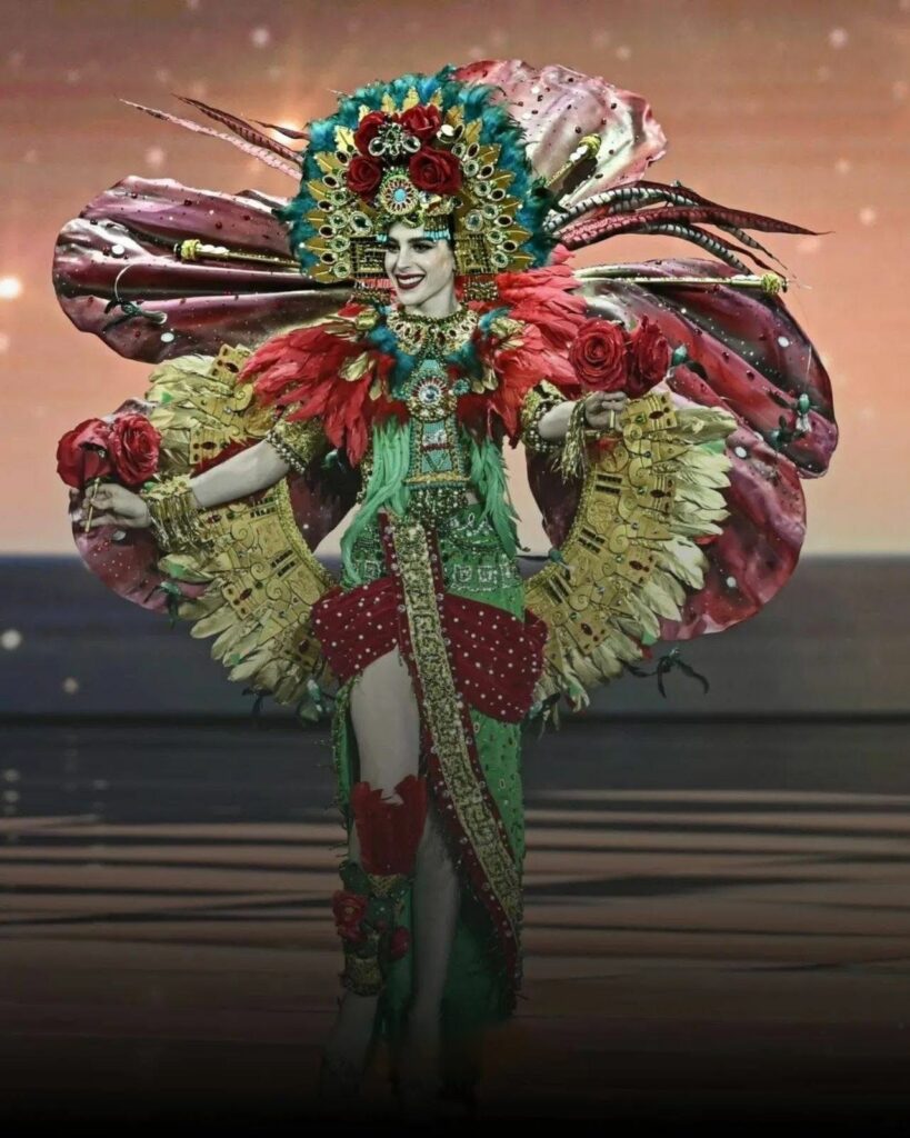 Fátima Bosch, representante de México, desfiló en Miss Universo 2025 con un traje típico inspirado en la diosa mexica Xochiquetzal, diseñado por el tampacanense Fernando Ortiz.