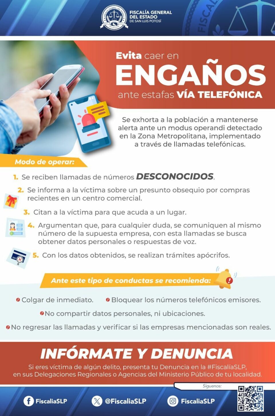 La Fiscalía General del Estado de San Luis Potosí (FGESLP) hace un llamado a la ciudadanía para que mantenga previsiones y evite caer en estafas telefónicas. Recientemente, se ha detectado un modus operandi en la zona metropolitana, donde estafadores se comunican con las víctimas para informarles que han ganado un supuesto premio por compras realizadas en un centro comercial.