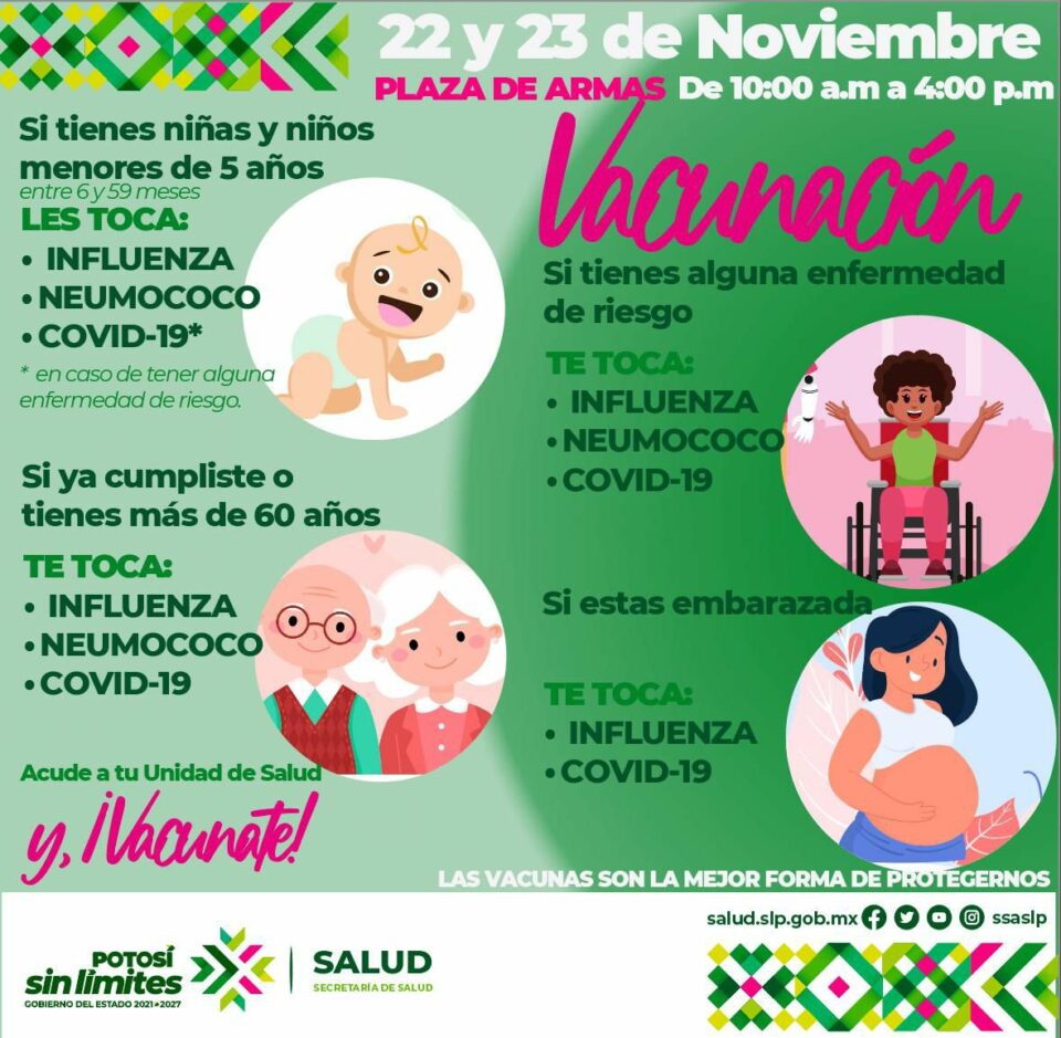 Con el objetivo de reforzar la protección de la población ante la temporada invernal, este fin de semana se instalarán módulos de vacunación contra influenza, COVID y neumococo en distintos puntos de la zona metropolitana de San Luis Potosí. La jornada se llevará a cabo el sábado y domingo, en un horario de 10:00 a 16:00 horas.