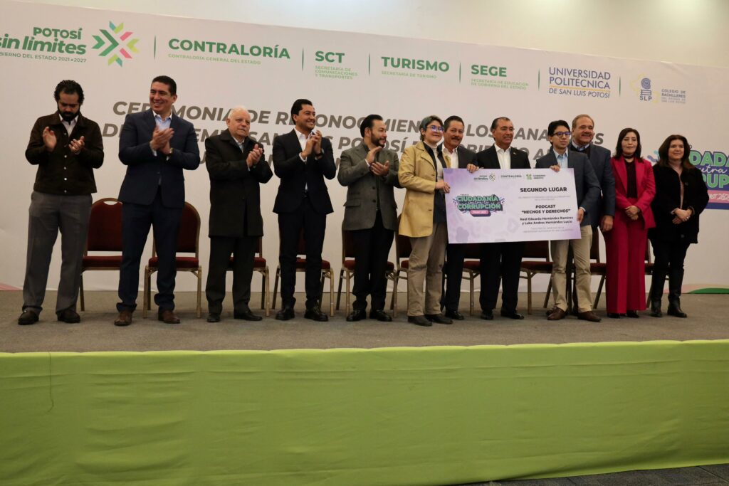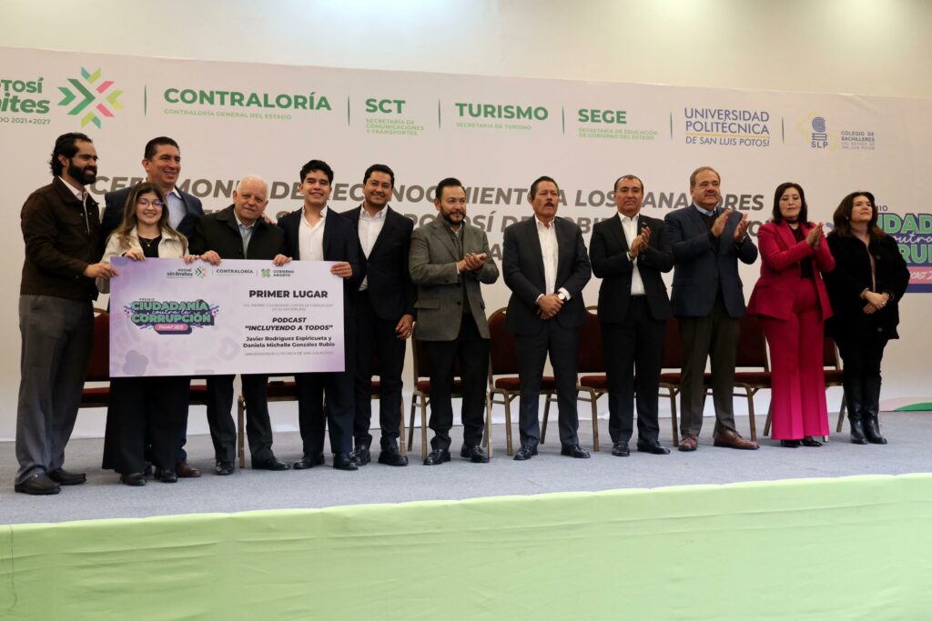 También se reconoció a los jóvenes triunfadores del concurso “PODCAST, Ciudadanía contra la Corrupción”, otorgando el primer lugar al proyecto “Incluyendo a Todos” de alumnos de la Universidad Politécnica de San Luis Potosí (UPSLP), el segundo lugar para el proyecto “Hechos y Derechos, Podcast” de estudiantes de la Universidad Autónoma de San Luis Potosí (UASLP).