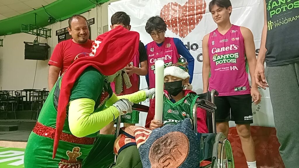 El pequeño fue muy apapachado, recibió obsequios, observó la práctica y en su entusiasmo se incorporó de la silla de ruedas para tomar el balón e intentar una canasta.