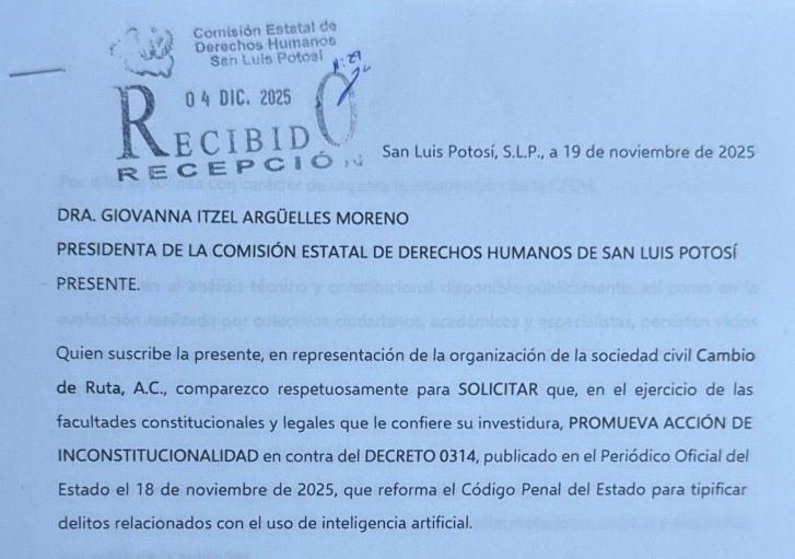 La organización Cambio de Ruta pidió a la Comisión Estatal de Derechos Humanos (CEDH), promover una acción de inconstitucionalidad a la contra el Decreto 0314, publicado en el Periódico Oficial del Estado el pasado 18 de noviembre de 2025, que reforma el Código Penal del Estado, para tipificar delitos relacionados con el uso de la inteligencia artificial.
