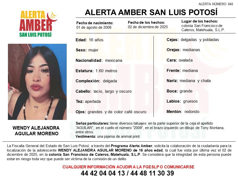 La Fiscalía General del Estado de San Luis Potosí (FGESLP) activó una ficha de Alerta Amber para la localización de Wendy Alejandra Aguilar Moreno, quien tuvo contacto por última vez con sus familiares el 2 de diciembre de 2025, en la colonia San Francisco de Caleros, en Matehuala.
