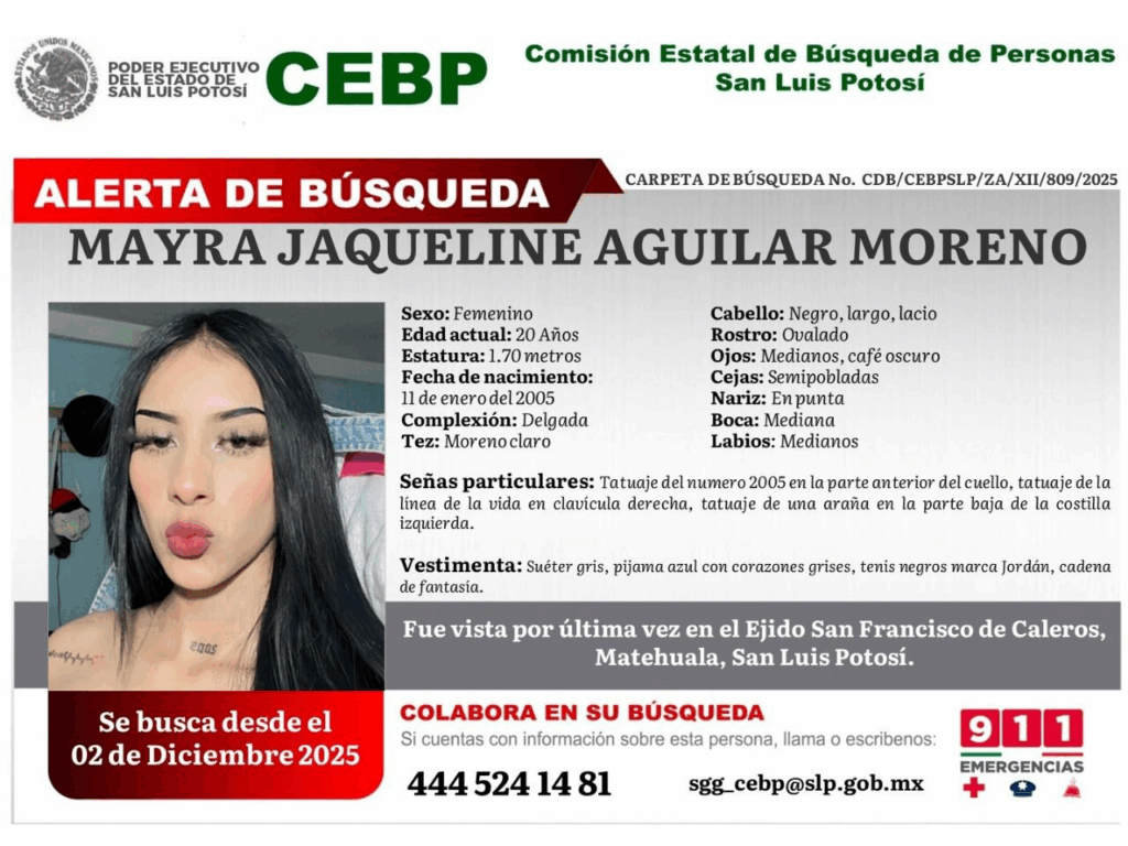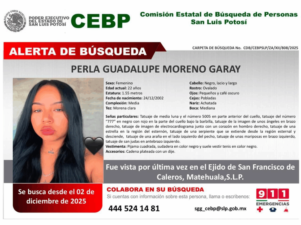 El caso más reciente corresponde a Cielo Guadalupe Loredo, cuya desaparición fue difundida por la CEBP la noche del martes 9 de diciembre. Fue vista por última vez en la colonia Nuevo Progreso, ubicada en la capital potosina. Entre sus características físicas destacan dos perforaciones en el lado derecho de la nariz y una más en el labio inferior de manera transversal.