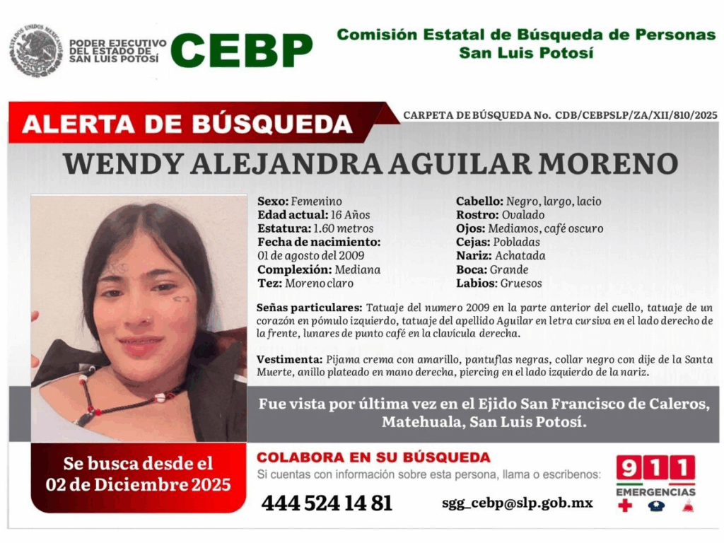 Por su parte, Wendy Alejandra cuenta con tatuajes del número 2009 en la zona frontal del cuello, un corazón en el pómulo izquierdo, el apellido “Aguilar” en letra cursiva en el costado derecho de la frente, además de lunares color café en la clavícula derecha. Por tratarse de una menor de edad, se activó la Alerta Amber para su localización.
