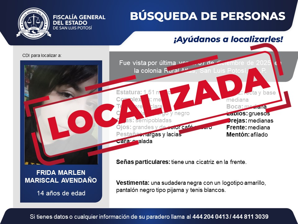 El domingo 7 de diciembre se dio a conocer la desaparición de Frida Marlen Mariscal Avendaño, una adolescente de 14 años que fue vista por última vez en la colonia Rural Atlas. Sin embargo, la Fiscalía Especializada en Materia de Derechos Humanos confirmó el martes 9 de diciembre que la menor fue encontrada.