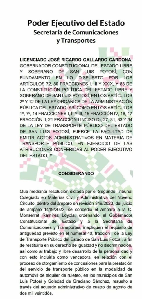 El Gobierno del Estado emitió un fallo para reconocer a Monserrat Ramírez Loyola como ganadora en el proceso de asignación de concesiones de taxi de ruleteo para la capital y Soledad de Graciano Sánchez, esto luego de un mandato Judicial.