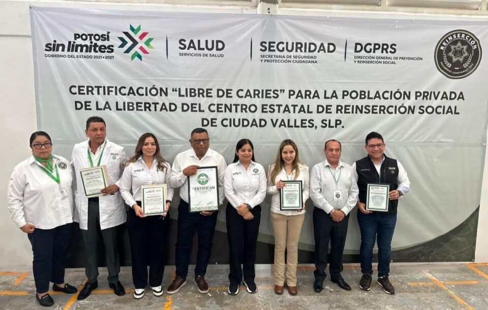 La Secretaría de Seguridad y Protección Ciudadana del Estado, a través de la Dirección General de Prevención y Reinserción Social, llevó a cabo la entrega del reconocimiento por Certificación Libre de Caries al Centro Estatal de Reinserción Social de Ciudad Valles, como resultado del trabajo coordinado para fortalecer la atención integral en materia de salud dentro del sistema penitenciario.