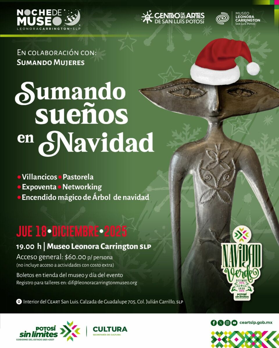 El museo Leonora Carrington será sede este 18 de diciembre a partir de las 19:00 horas de “Sumando sueños en Navidad”, una edición especial de Noche de Museo que conjuga arte, convivencia y espíritu solidario, en coordinación con la Red Sumando Mujeres. La programación contempla música en vivo a cargo de la Banda Sinfónica de la Escuela Estatal de Música, así como un repertorio de villancicos interpretados por el Coro de la Escuela de Iniciación del Centro de las Artes de San Luis Potosí (Ceart), creando un ambiente festivo y accesible para todo público.