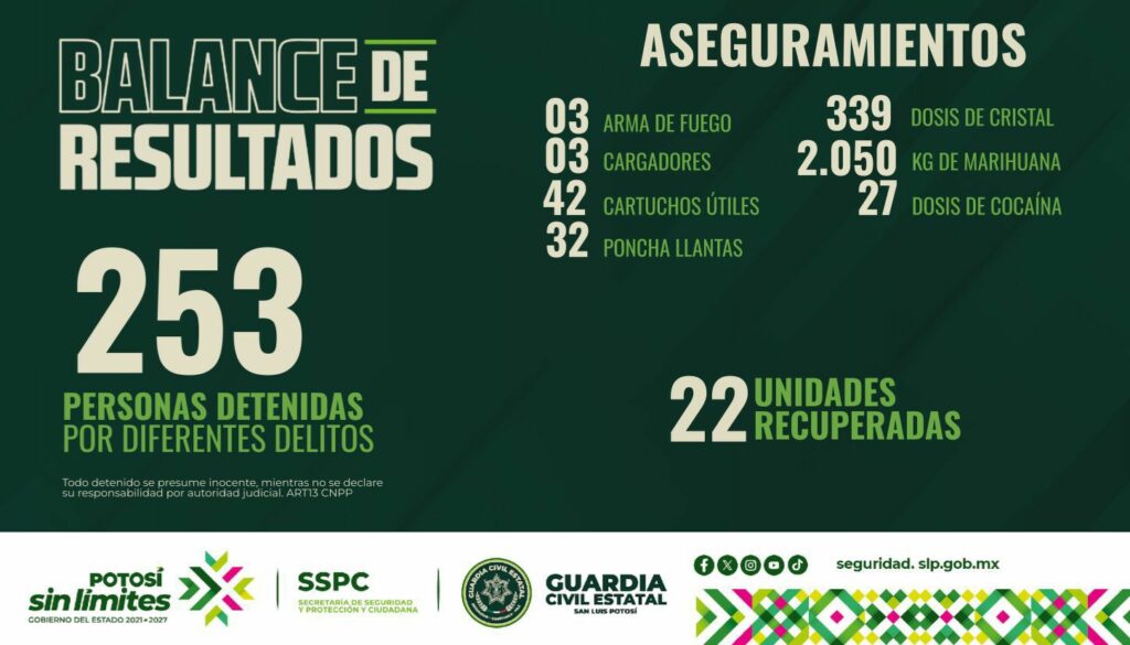 Derivado del Plan Integral de Seguridad, los resultados enfocados en preservar la tranquilidad de las familias potosinas, son permanentes, muestra de ello fue la detención de 253 personas, durante el periodo del 13 al 19 de diciembre, del presente año, en donde 252 quedaron ante la Fiscalía General del Estado y una más al Juez Cívico Calificador, por faltas administrativas.