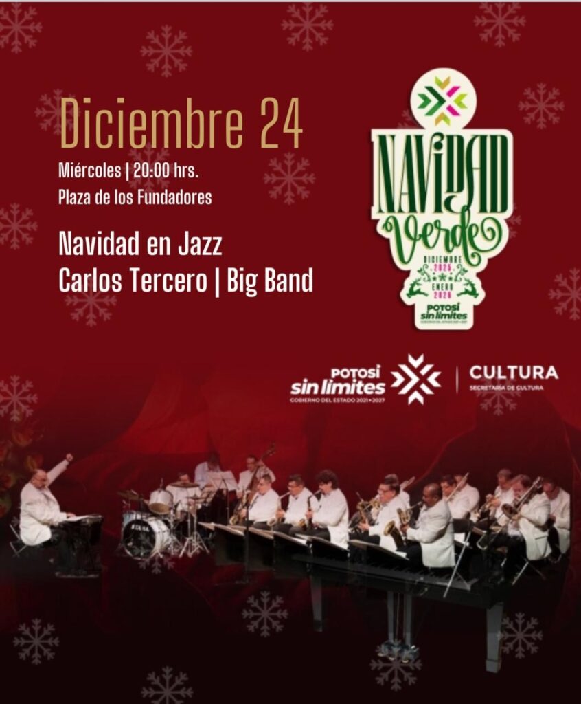 Para el miércoles 24 de diciembre, también a las ocho de la noche, la Gran Big Band dirigida por Carlos Tercero llegará a Plaza de Fundadores con el concierto Navidad en Jazz, donde los villancicos tradicionales se fusionan con ritmos de swing. Será una noche vibrante que consolida una celebración navideña cercana e incluyente para las y los potosinos.