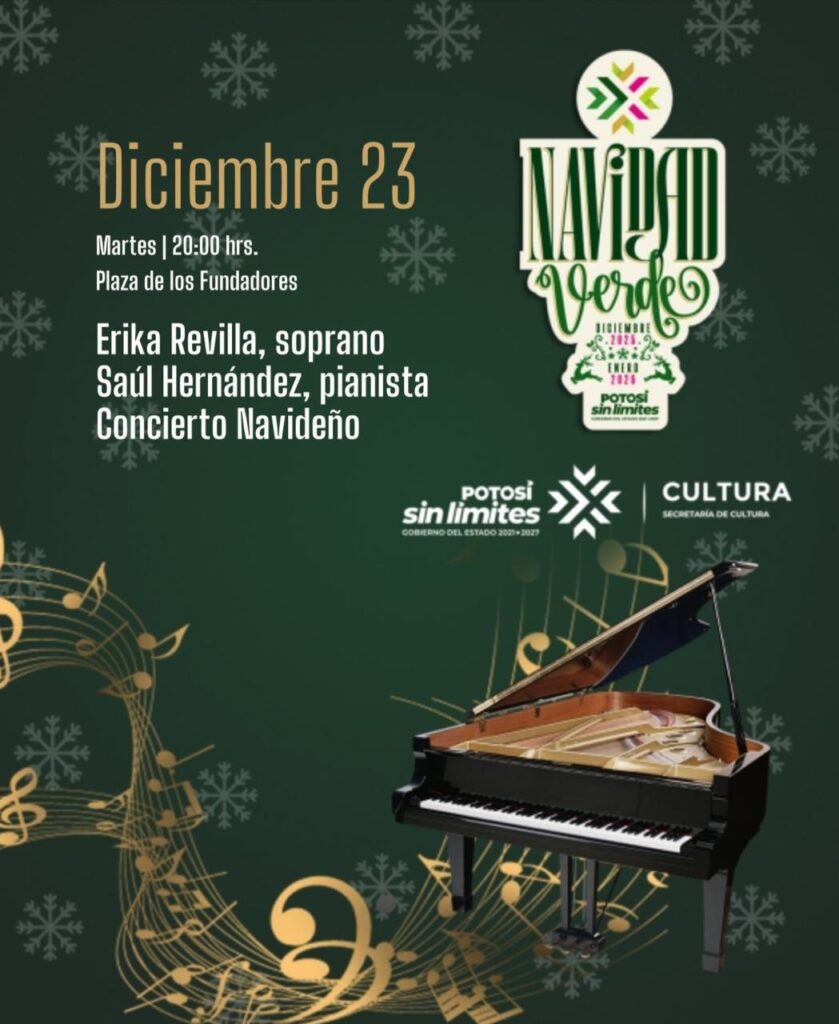 El martes 23 de diciembre, a las ocho de la noche, el público podrá disfrutar de un concierto navideño a cargo de la soprano Erika Revilla, acompañada al piano por Saúl Hernández. La presentación ofrecerá un repertorio de música clásica con piezas especialmente seleccionadas para fortalecer el espíritu de la temporada y brindar una experiencia artística de alto nivel.