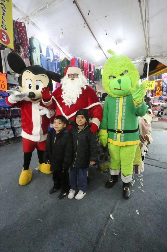 En el marco de la temporada decembrina, el ambiente se llenó de color y alegría con la presencia de personajes como Santa Claus, Mickey Mouse y el Grinch, quienes convivieron con las familias asistentes y se tomaron fotografías con niñas, niños y adultos, creando momentos de convivencia y celebración.