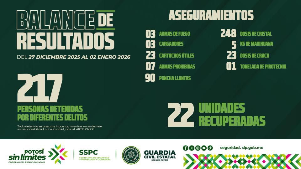 Durante las labores preventivas del periodo comprendido del 27 de diciembre de 2025 al 02 de enero del 2026, la Guardia Civil Estatal detuvo a 222 personas, presumiblemente vinculadas en actividades ilegales. Cinco de ellas quedaron a disposición de autoridades federales, mientras que 217 fueron puestas ante la Fiscalía General del Estado.