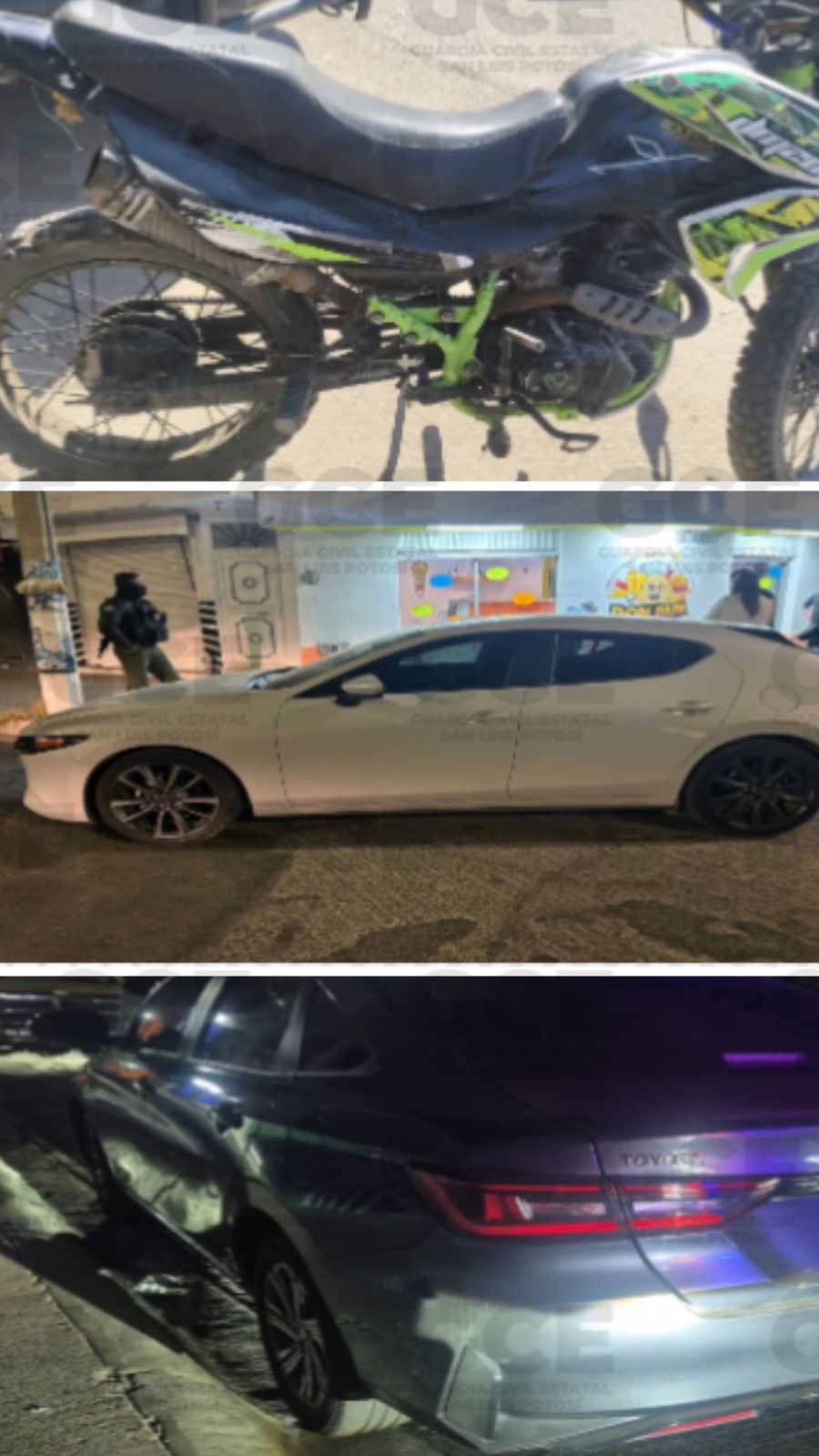 Mientras que, en la colonia Valle Dorado, la Guardia Civil Estatal, localizó un vehículo marca Mazda, hurtado en Silao, Guanajuato. La División Caminos de la GCE, ubicó un automotor lineal Yaris, hurtado de la colonia Praderas del Maurel, en Soledad de Graciano Sánchez. La unidad se localizó en este mismo municipio.