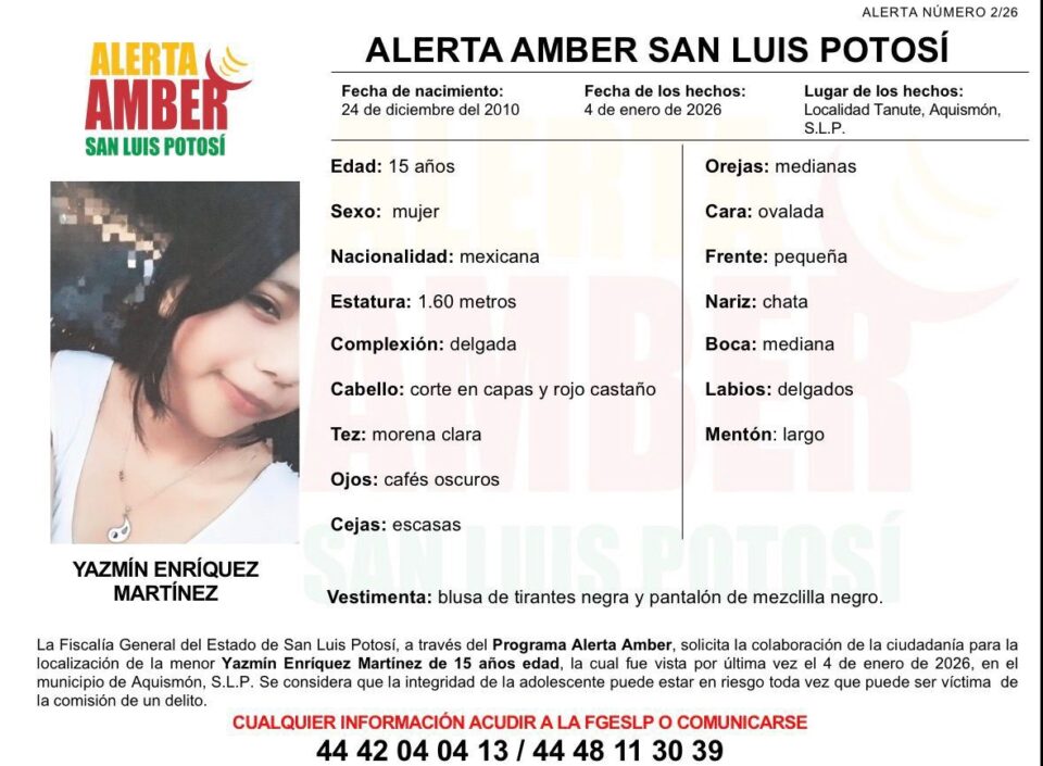 Agentes de la Fiscalía General del Estado de San Luis Potosí (FGESLP) iniciaron una Alerta Amber para la localización de Yazmín Enríquez Martínez, quien fue vista por última vez el 4 de enero de 2026, en la comunidad Tanute en Aquismón.