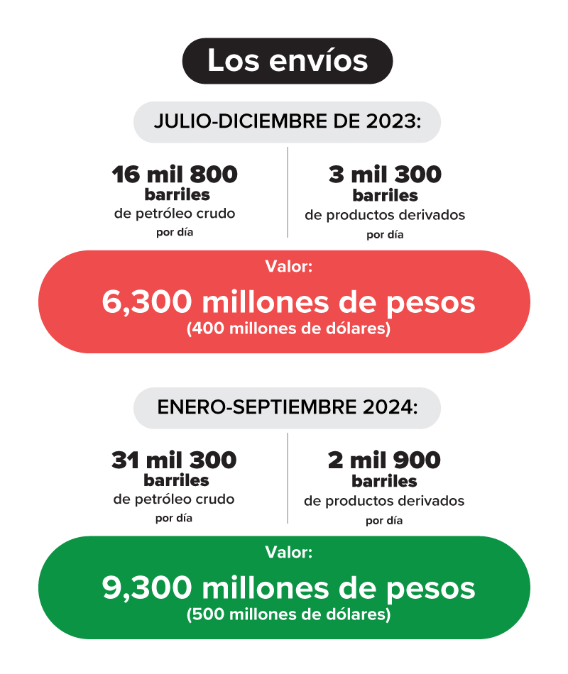 En reportes entregados a inversionistas de la Bolsa, Pemex ha informado que de julio de 2023 a septiembre de 2024, envió a la isla petróleo crudo y productos derivados por alrededor de 15 mil 600 millones de pesos a través de Gasolinas Bienestar SA de CV, empresa filial que fue creada en febrero de 2022.
