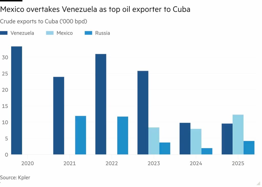 En 2025, México se convirtió en el principal proveedor de petróleo de Cuba, desplazando a Venezuela, indica una nota del Financial Times de Estados Unidos titulada “México se arriesga a la ira de Trump con los envíos de petróleo a Cuba”.