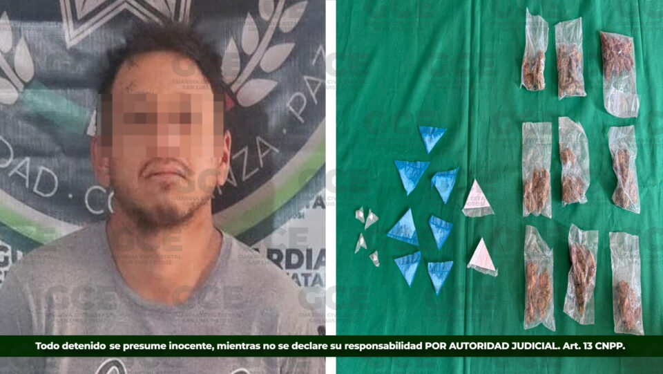 Las acciones de inteligencia y vigilancia permitieron que los elementos de la Guardia Civil Estatal lograran el aseguramiento de 96 dosis de “cristal”, 958.8 gr de marihuana, un arma corta, 13 cartuchos útiles, un cargador, cinco dosis de cocaina, 4 dosis de “crack”, 13 pastillas psicotrópicas, 47 artefactos metálicos mejor conocidos como “poncha llantas”, además del monetario de 7 mil 250 pesos y 415 dólares