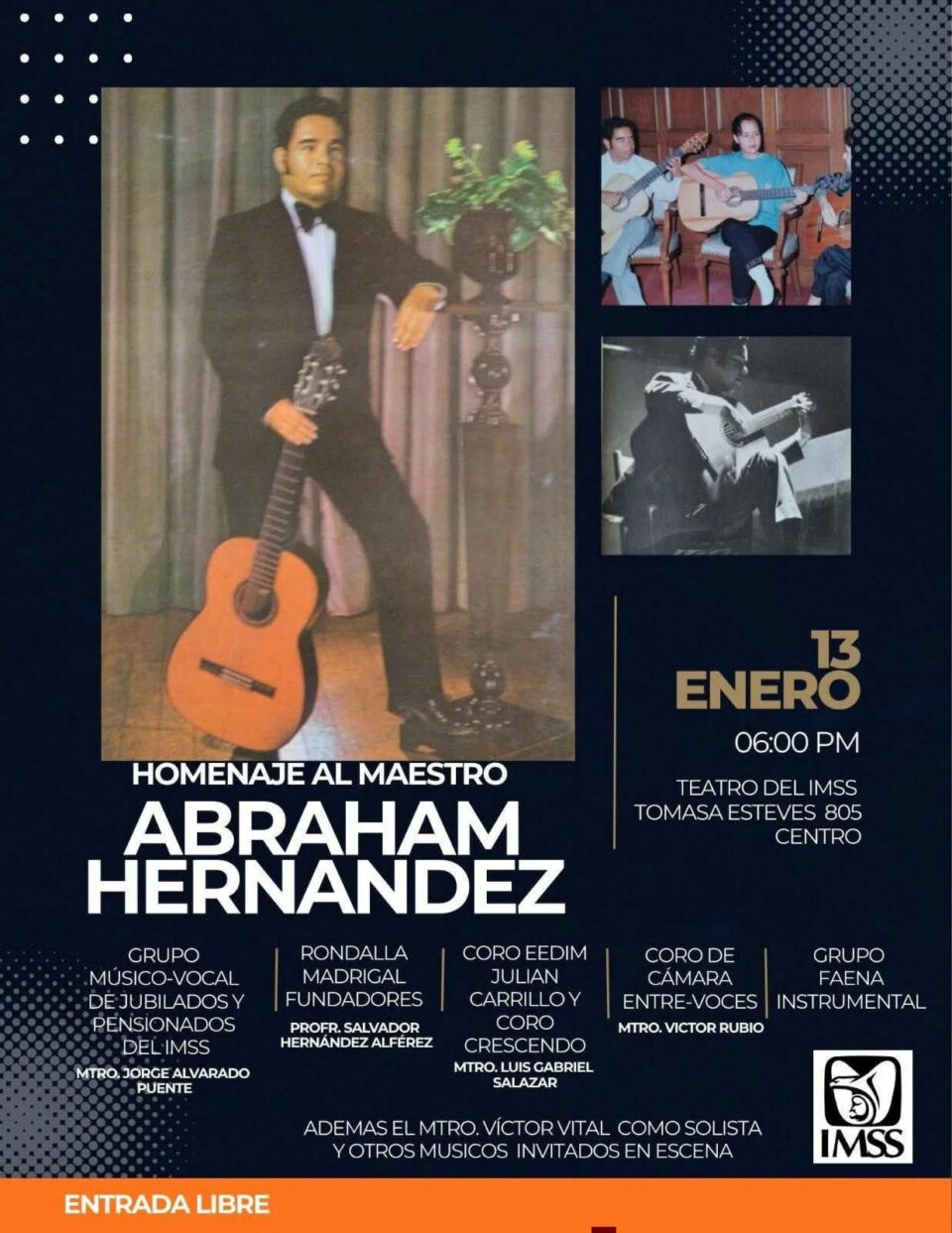 En el marco del primer aniversario luctuoso del Mtro. Abraham Hernández Ortiz, se realizará un homenaje musical este martes 13 de enero a las 18:00 horas, en el Teatro del IMSS, con entrada libre.