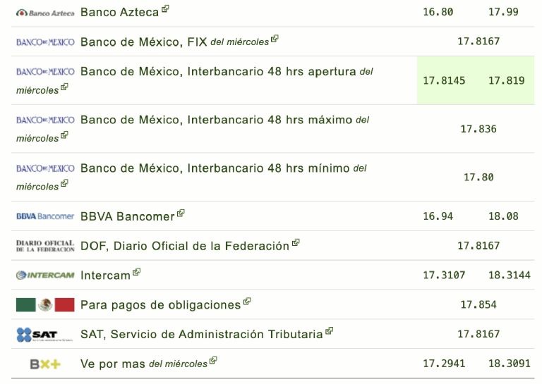 Banco Azteca: 16.80 a la compra / 17.99 a la venta