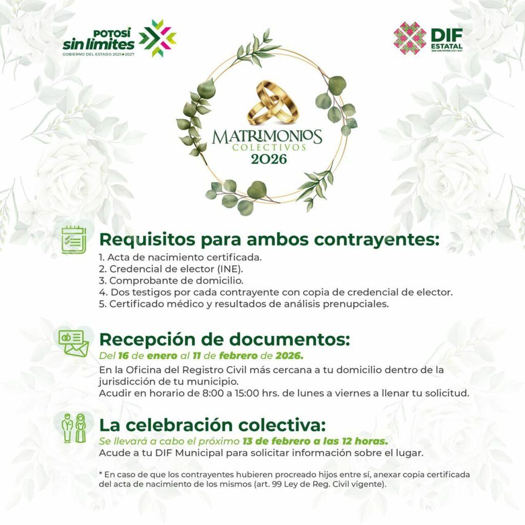 Por quinto año consecutivo el Sistema Estatal para el Desarrollo Integral de la Familia (DIF), llevará a cabo la campaña de Matrimonios Colectivos, que busca fortalecer el tejido familiar y brindar protección legal a las familias potosinas.