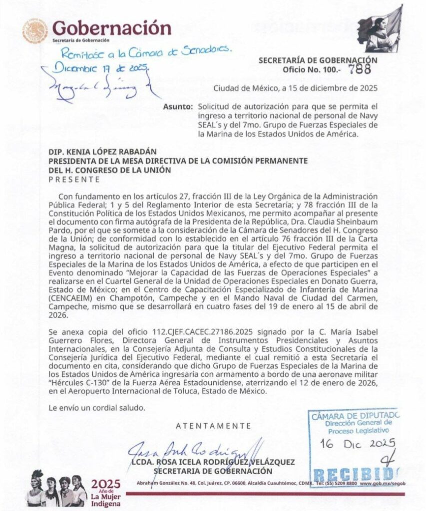 “La Constitución es clara: el artículo 76, fracción III, establece que la facultad para autorizar el ingreso y tránsito de tropas extranjeras corresponde exclusivamente al Senado”, señaló Castañeda en X, en un mensaje en el que adjuntó una copia de la solicitud presentada por la mandataria a finales del año pasado.