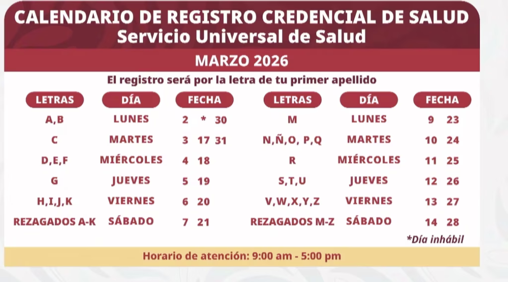 El registro de la Credencial del Servicio Universal de Salud se llevará a cabo durante marzo de 2026, de forma presencial, en módulos del Bienestar instalados en todo el país. El trámite se organiza por la letra inicial del primer apellido, con el objetivo de evitar saturaciones.