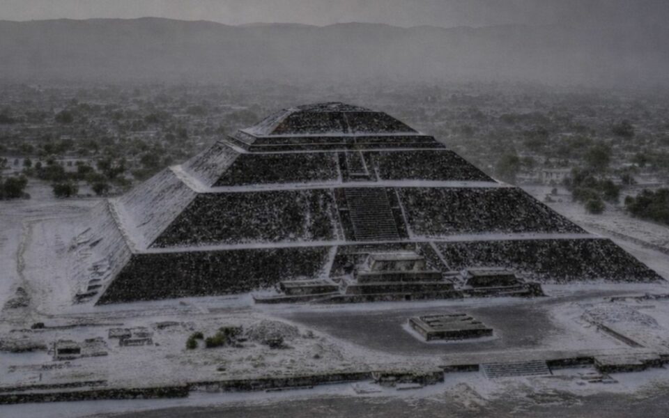 Fuerte lluvia, acompañada de granizo, en partes del Estado de México, hand dejado diversas afectaciones en el municipio de Teotihuacán, cuyas calles e icónicas pirámides terminaron cubiertas de blanco.