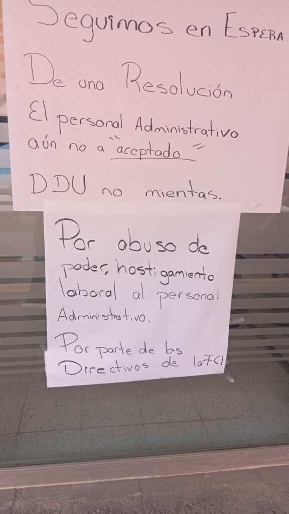 Los quejosos colocaron una serie de pancartas al interior de la facultad donde se lee: “Seguimos en espera de una resolución. El personal administrativo aún no a “aceptado”. DDU no mientas”, “por abuso de poder, hostigamiento laboral al personal administrativo por parte de los directivos de la FCI”, entre otros.