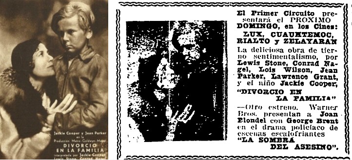 El Viernes 18 de Mayo de 1934, El Informador anunciaba, en su sección de espectáculos (página 6), que los cines Lux, Cuauhtémoc, Rialto y Zelayarán presentarían Divorcio en la familia (Divorce in the family, dirigida por Charles F. Reisner, 1932). La película ya es de la MGM. La puedes ver en la red Одноклассники (Odnoklassniki) en la Liga 3. La descripción en la cartelera tapatía de 1934 decía que se trataba de una “deliciosa obra de tierno sentimentalismo” con “el niño Jackie Cooper”.