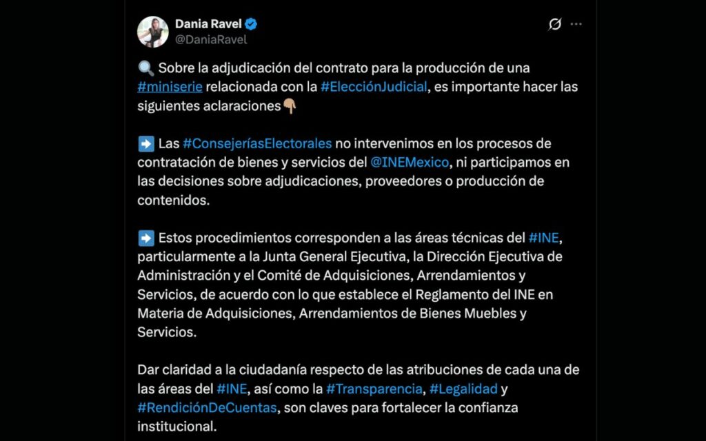 Por su parte, la consejera Dania Ravel emitió un posicionamiento similar, explicando las competencias técnicas dentro del árbitro electoral. Ravel sostuvo que “las Consejerías Electorales no intervenimos en los procesos de contratación de bienes y servicios del INE, ni participamos en las decisiones sobre adjudicaciones, proveedores o producción de contenidos”.