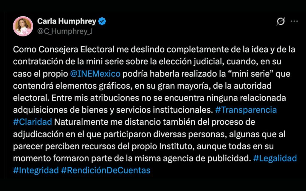 A través de su cuenta en la red social X, la consejera Carla Humphrey cuestionó la necesidad de realizar tal documental fuera de la institución: “Como Consejera Electoral me deslindo completamente de la idea y de la contratación de la mini serie sobre la elección judicial, cuando, en su caso el propio INE podría haberla realizado”.