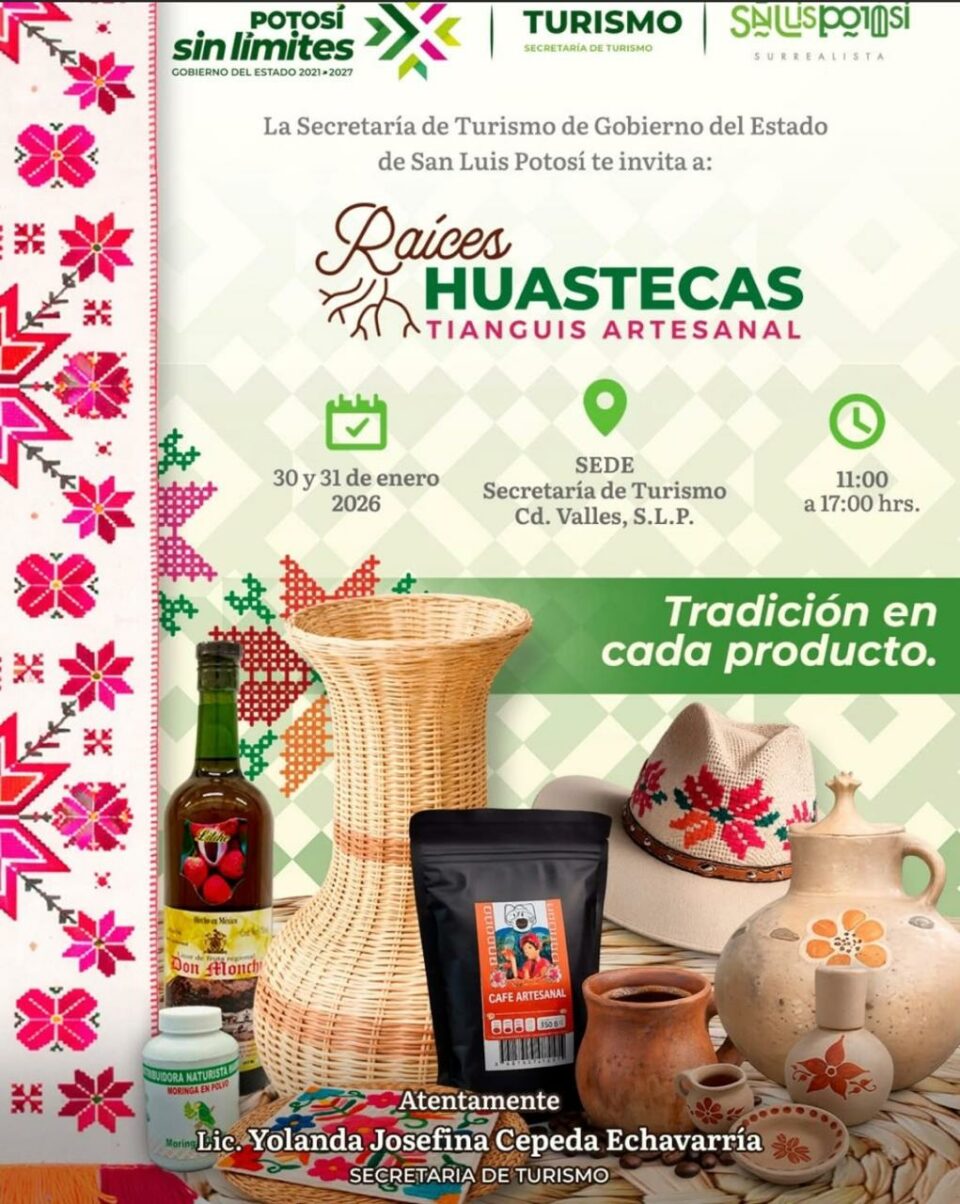 La Secretaría de Turismo del Gobierno del Estado de San Luis Potosí informó sobre la realización del tianguis artesanal “Raíces Huastecas”, un espacio dedicado a la promoción y difusión de las tradiciones, saberes y productos elaborados por comunidades artesanas de la región Huasteca.
