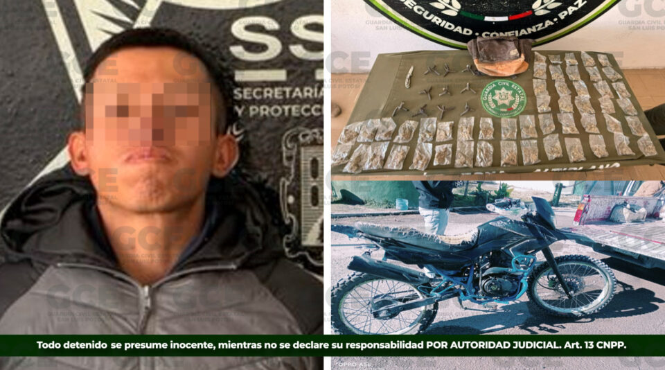 En un segundo hecho, ocurrido en el municipio de Ciudad Valles, los agentes estatales detuvieron a Edgar “N” de 30 años, presuntamente vinculado a un grupo delictivo con presencia en la región. En esta intervención se aseguraron 15 dosis de “cristal”, 10 dosis de marihuana, 14 artefactos metálicos mejor conocidos como “ponchallantas”, así como una motocicleta.