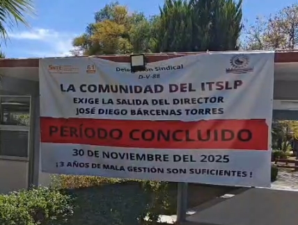 Trabajadores y maestros del Instituto Tecnológico de San Luis Potosí (ITSLP) exige la salida del director, José Diego Bárcenas Torres, debido a que su periodo concluyó el pasado 30 de noviembre y “tres años de mala gestión fueron suficientes”, debido a la violencia laboral que ejerce en su contra.