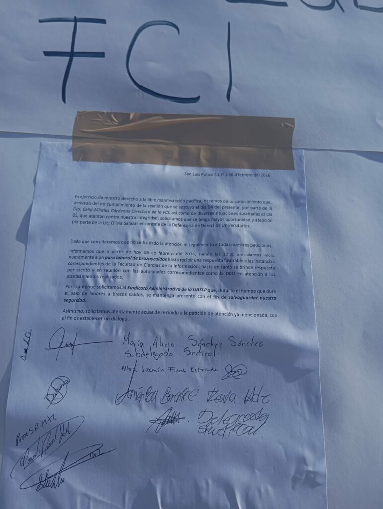 Trabajadores administrativos de la Facultad de Ciencias de la Información (FCI) de la Universidad Autónoma de San Luis Potosí (UASLP), regresaron a paro laboral por incumplimiento de acuerdos por parte del rector Alejandro Zermeño Guerra y la directora Celia Mireles.