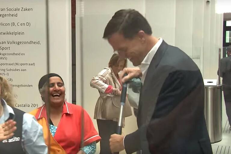 En el video que captó el momento, se observa que el político holandés pide un trapeador y al ver a una trabajadora de la limpieza se lo arrebata  entre risas.
