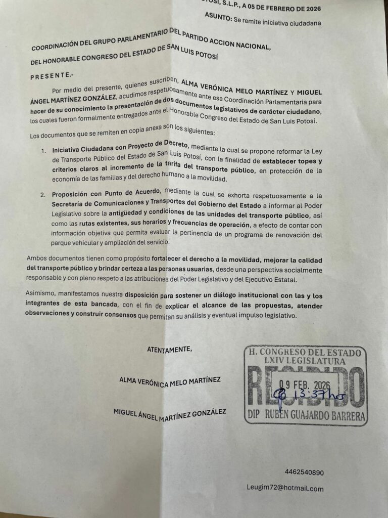 Los ciudadanos Alma Verónica Melo Martínez y Miguel Ángel Martínez González presentaron una iniciativa para reforma y adicionar disposiciones a los artículos 90 y 94 de la Ley del Transporte Público del Estado de San Luis Potosí, con el objetivo de establecer topes y reglas claras sobre el incremento a la tarifa del transporte urbano.