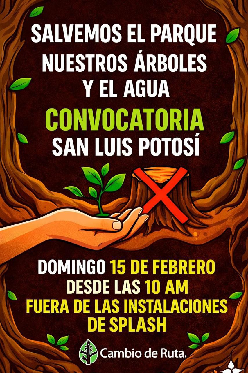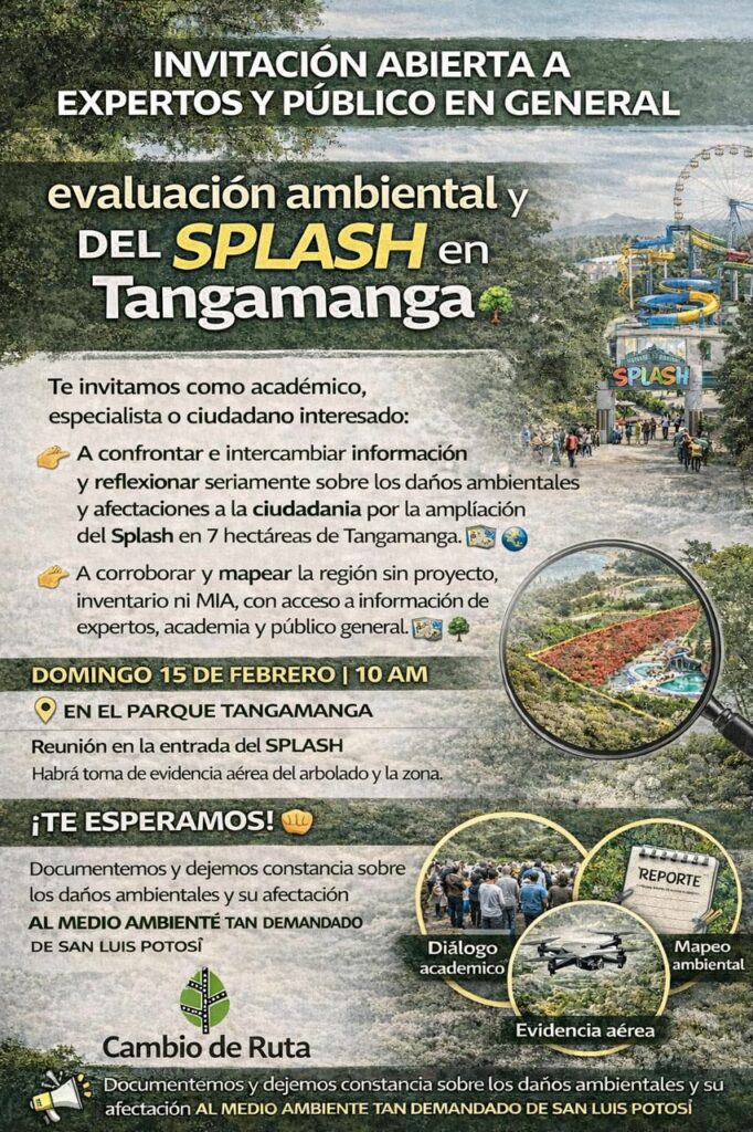 Integrantes de la organización Cambio de Ruta convocaron a especialistas y al público en general a una evaluación ambiental del área conocida como Splash, dentro del Parque Tangamanga. A través de redes sociales, informaron que el encuentro se llevará a cabo el 15 de febrero, en el parque, como un ejercicio abierto de análisis y documentación sobre las condiciones ambientales de la zona.