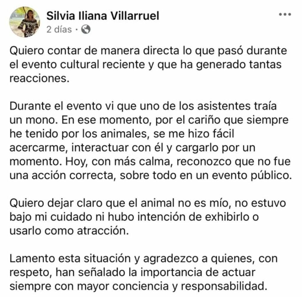 En sus redes sociales, Silvia Iliana Villarruel explicó que el mono araña no era suyo. Afirmó que el ejemplar era de una persona que asistió al evento cultural.