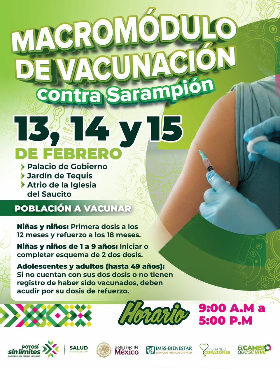 Del 13 al 15 de febrero se instalarán macro módulos de vacunación contra el sarampión en distintos puntos de la capital potosina y del municipio de Soledad de Graciano Sánchez, como parte de una jornada preventiva coordinada entre autoridades estatales y el IMSS Bienestar.
